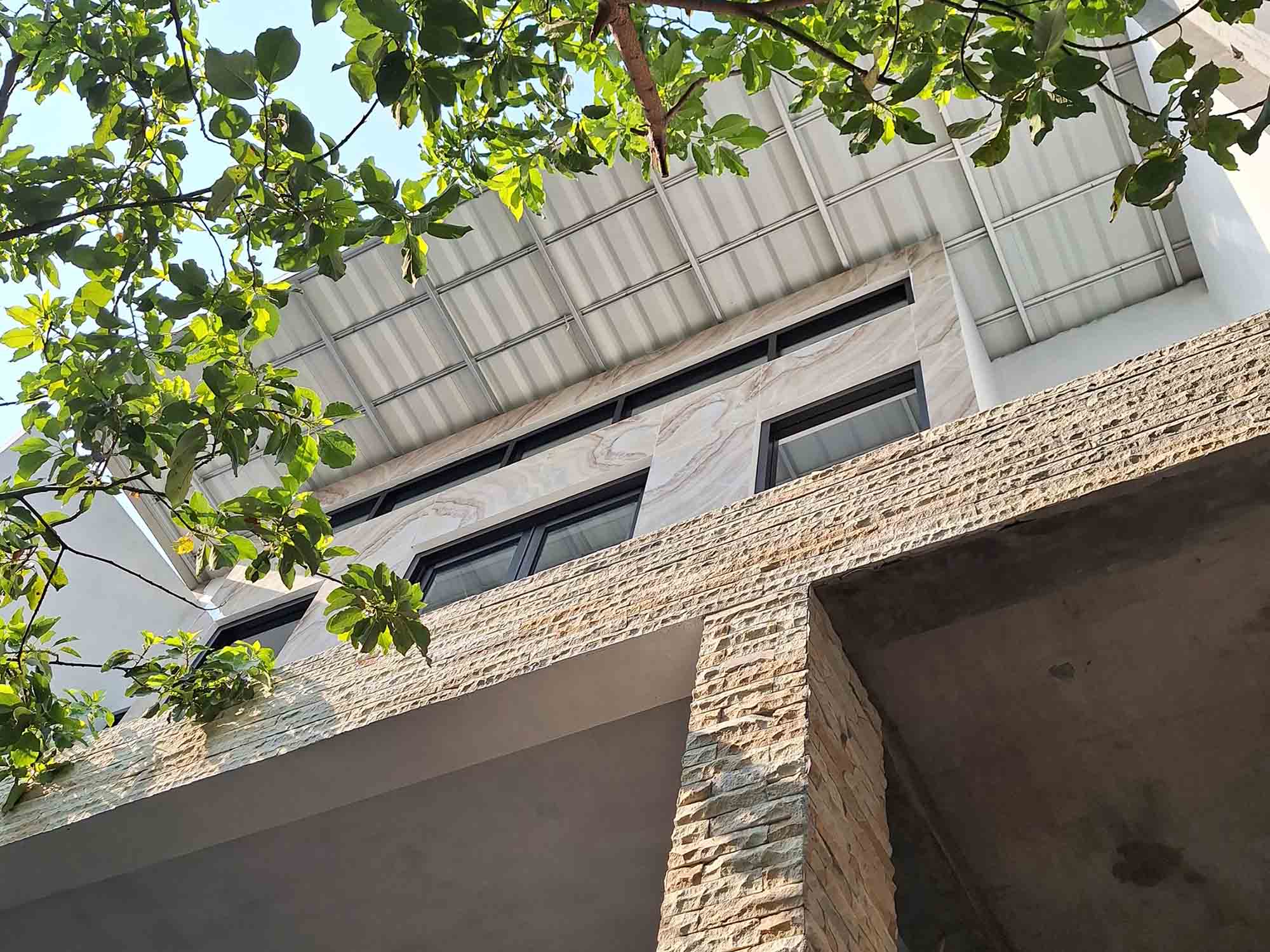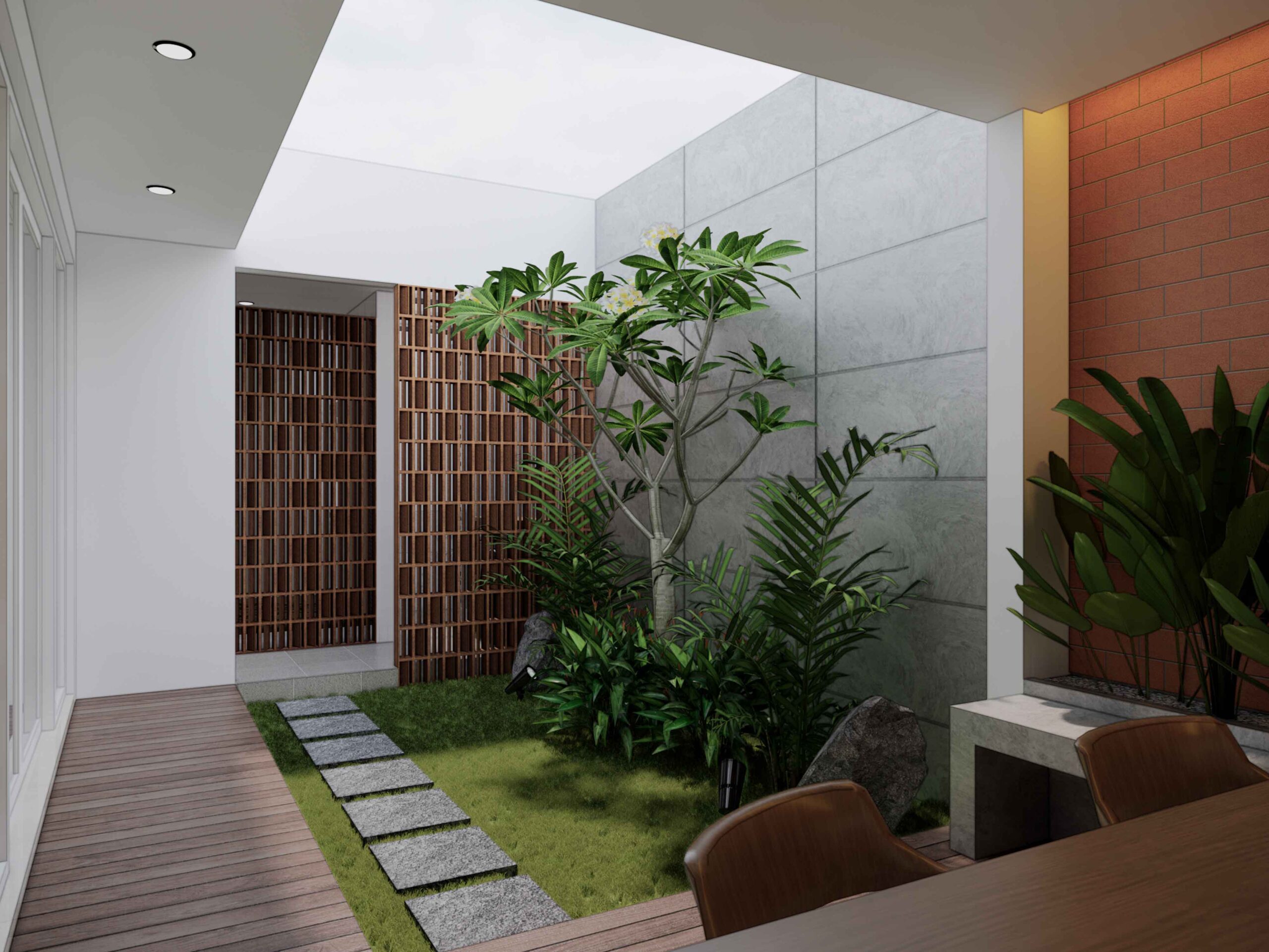 Project rumah dengan pendekatan desain minimalis. selain memiliki bentuk fasad yang simple, dengan berbentuk kotak. Penerapan warna menggunakan warna netral dan natural. seperti putih, terakota dan abu-abu.