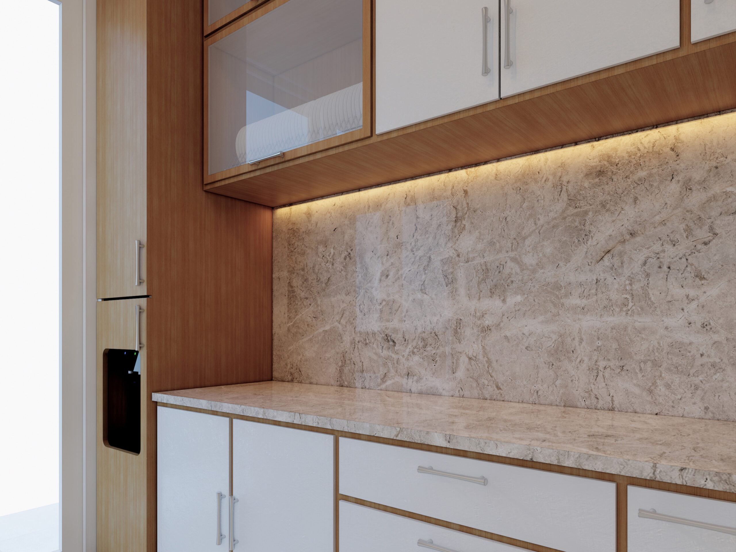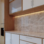 Custom furniture cabinet pantry dengan memiliki beberapa pertimbangan kombinasi warna menjadikan visual yang tampak berbeda. Sedangkan granite pada top table berfungsi untuk perawtan yang lebih mudah. Custom furniture menggunakan bahan pvc board finishing HPL.