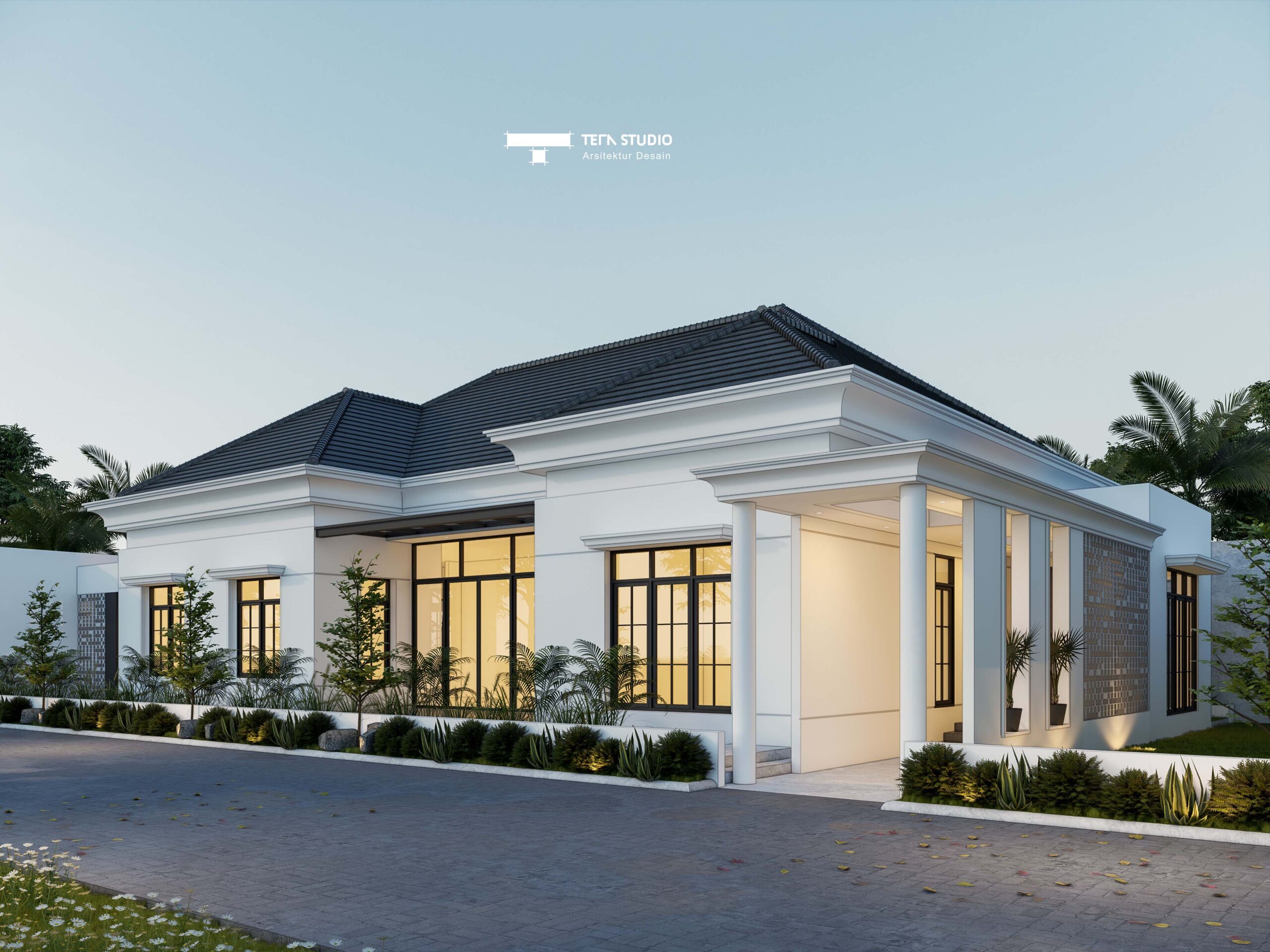 Project desain villa yang berlokasi di kepulauan bangka belitung, memiliki 4 kamar tidur dengan kamar mandi dalam. Untuk fasad menggunakan konsep arsitektur klasik modern agar bangunan terlihat lebih mewah.